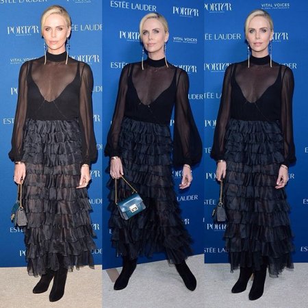 На светском приеме кинодива появилась в довольно соблазнительном наряде. Черное длинное платье от Giambattista Valli можно было бы охарактеризовать как довольно пикантный наряд. Его верхняя часть не просто состоит из полупрозрачной ткани, но в некотором роде исключает возможность надеть бюстгальтер. А вот многослойный длинный подол, напротив, делает образ актрисы довольно сдержанным и скромным. Кроме того, подобный фасон сыграл Шарлиз на руку еще и тем, что визуально помог ей казаться стройнее.