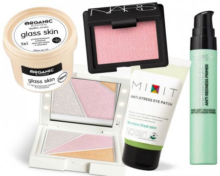 Цветокорректирующий праймер, L'Oreal ParisМаска-патч, MIXITУспокаивающий сияющий крем, Organic KitchenСияющая компактная пудра, ArtistryРумяна, Nars