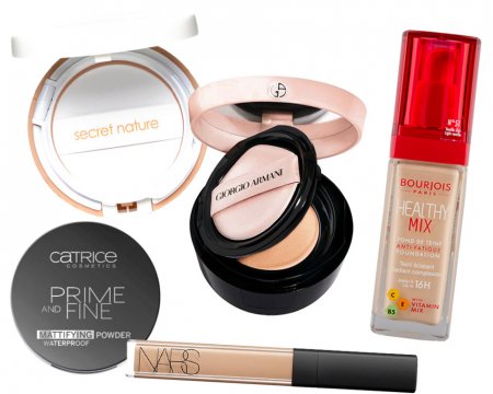 Косилер-крем, NarsТональный крем, BourjoisТональная основа-кушон, Secret NatureМатирующая пудра, CatriceТональный-флюид-кушон, Giorgio Armani