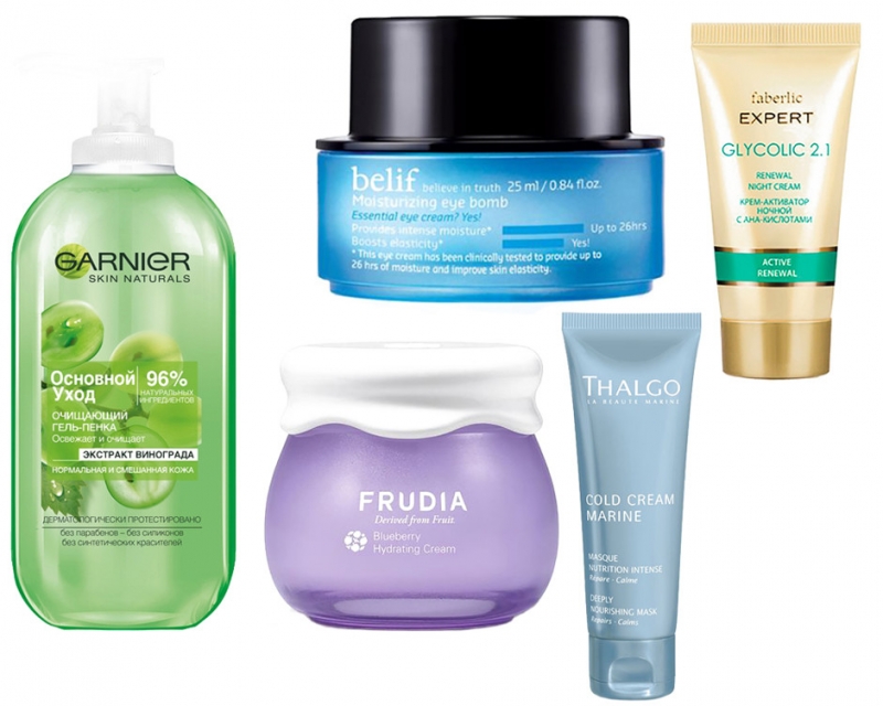 Успокаивающая маска, Thalgo; очищающая гель-пенка, Garnier; увлажняющий крем вокруг глаз, Belif; ночной крем-активатор, Faberlic; увлажняющий крем, FrudiaУмножь увлажнение на два