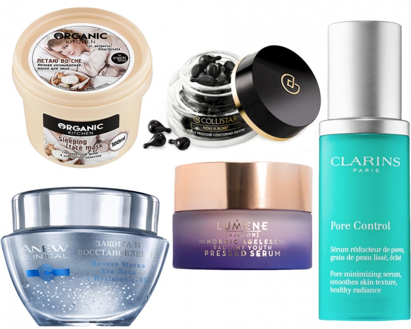 Ночная несмываемая маска для лица, Organic KitchenПрессованная сыворотка, LumeneНочная маска для лица Anew Clinical, AvonКапсулы для кожи вокруг глаз, CollistarСыворотка, Clarins