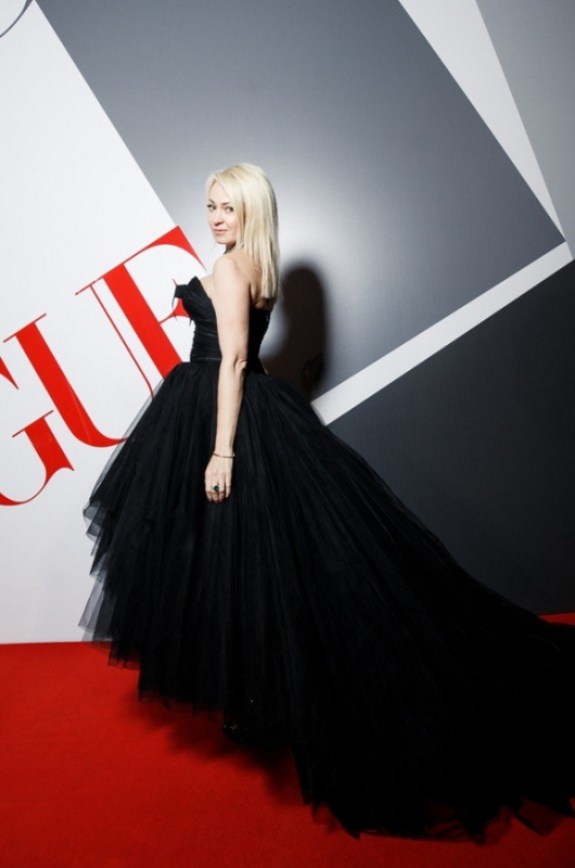 На вечеринку Vogue Яна приехала в пышном черном платье со шлейфом и с радостью позировала в нем фотографам. Пикантности образу Рудковской придали обнаженные плечи, а шика добавили переливающиеся детали на черных босоножках. Присутствовал на светском рауте и подопечный Яны, певец Дима Билан.