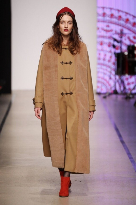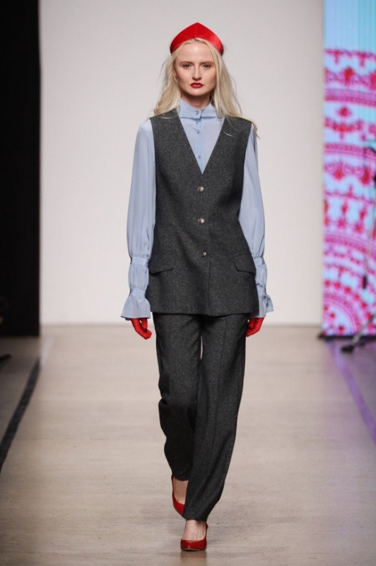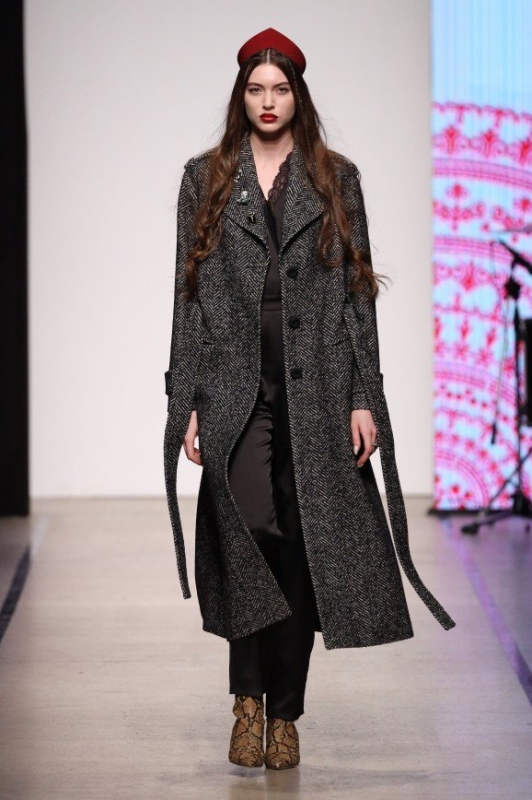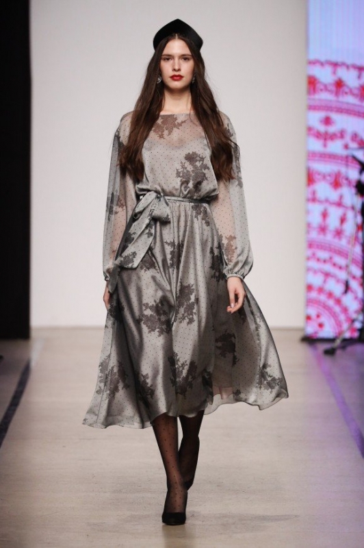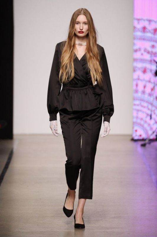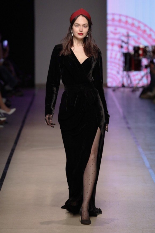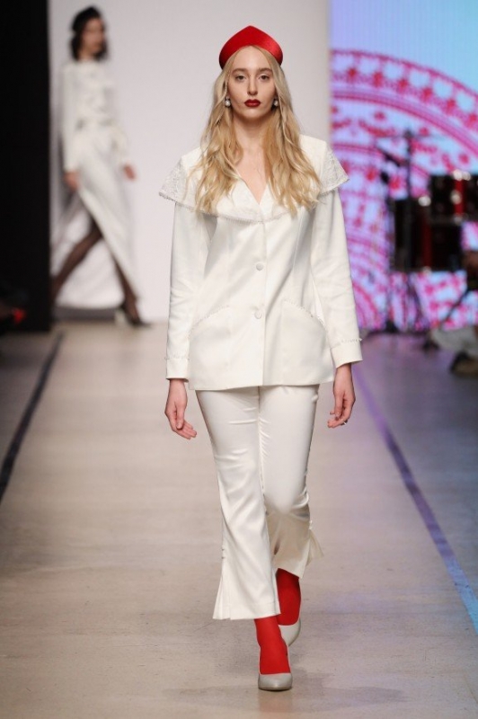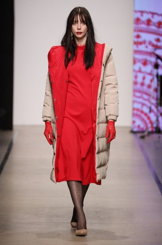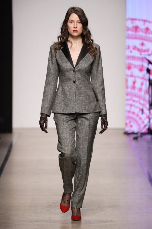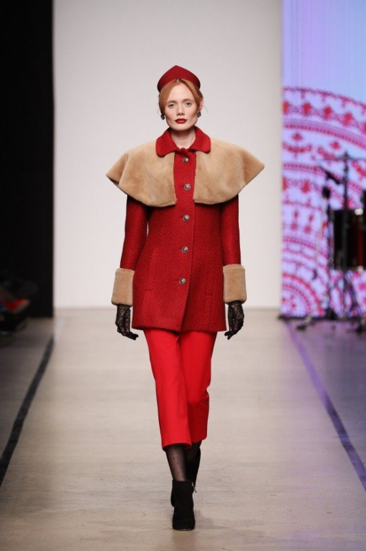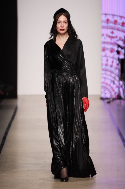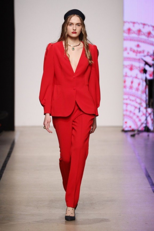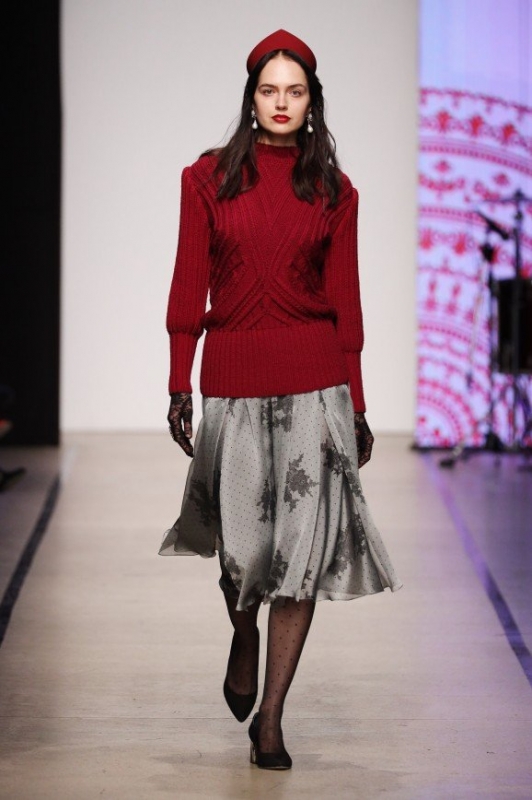 OKSANA FEDOROVA поддержала программу «Московское долголетие», в показе дизайнера участвовала модель старшего возраста. Свет погас и послышались звуки песни «Ах ты ноченька» в исполнении Дмитрия Хворостовского, и все в зале поняли, что коллекция - о России. Коллекция получилась спокойной, не вычурной и сдержанной. В деталях заметно, что действительно были переосмыслены российские костюмы разных эпох: рукава фонарики, головные уборы, напоминающие кокошники, кружевные перчатки, узоры, кафтаны, меховые воротники. Основные цвета коллекции - холодный бежевый, чёрный, красный, белый и серый. В некоторые моменты образы относили зрителей к образу крестьянки, в другие - к Анне Карениной и чему-то дворянскому. Но вся эта история была о женщине во всех ее проявлениях. Например, двубортный жакет с кюлотами в ломаную клетку, сочетающий белый и бежевый, подошёл бы современной и уверенной в себе девушке. А последнее бархатное платье со шлейфом стало бы отличным выбором для вечернего мероприятия.