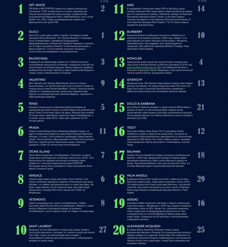 Каждый месяц Lyst анализирует шопинг-привычки и поведение более 5 миллионов интернет-покупателей, которые ищут, просматривают и приобретают модные товары у более чем 12 000 брендов и онлайн-магазинов. Отчет также учитывает статистику социальных сетей брендов - прирост количества подписчиков, и упоминание товаров, брендов на других площадках, анализ эмоциональной окраски всех сообщений.Итоги Lyst Index Q1 2019:Off-White стал самым популярным брендом на планете, а Gucci и Balenciaga заняли следующие две позиции. Saint Laurent и Palm Angels совершили наибольший скачок в Lyst Index в этом квартале, поднявшись на 17 и 11 места соответственно.