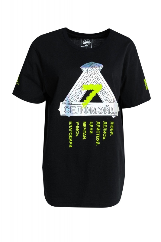 Противоположностью ему является слово «селфмейд». Люби, делись, действуй, цени, учись, мечтай, благодари — вот что связанно с этим словом. Также на всех принтах есть цифра «7» — отсылка к названию последнего альбома группы, который совсем недавно увидел свет.