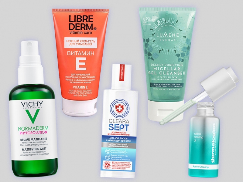Матирующий спрей для уменьшения жирного блеска, VichyОчищающий гель, LumeneКрем-гель для умывания, LibredermОчищающее масло с ретинолом, DermalogicaЛосьон с матереющим эффектом, Cleara Sept