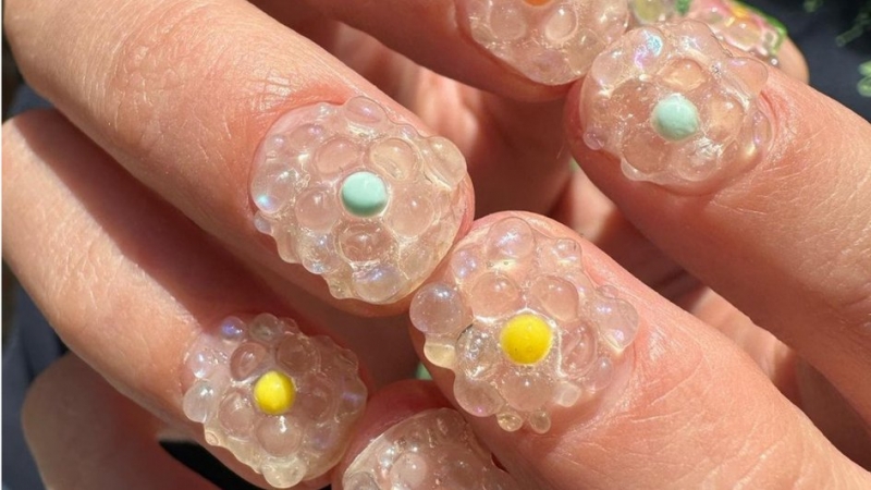 На ногтях может красоваться что угодно: от цветочков до более серьезных фигур.Источник: СоцсетиКак у мастеров получается достичь такого результата? Благодаря качественной работе с лаковой основой. Из нее на ногтях выкладывают прозрачные фигурки разных форм — от сердечек до шариков и кубиков.