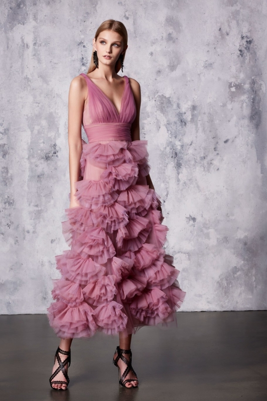 Модное новогоднее платье 2018 с оборками по всей длине юбки выбирайте с лаконичным верхом. Особенно удачно смотрятся модели с комбинированными фактурами, как у Reem Acra.