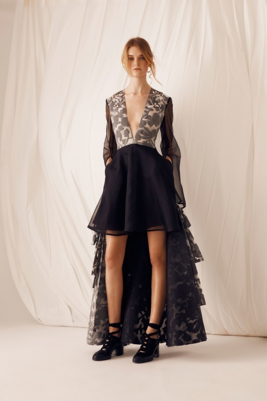 Дизайнеры представили довольно сдержанную цветовую гамму, в основном преобладает классический черный и белый. Но из всех правил есть исключение, хочется ярких красок – выбирайте наряд с крупным контрастным принтом, как у Badgley Mischka.