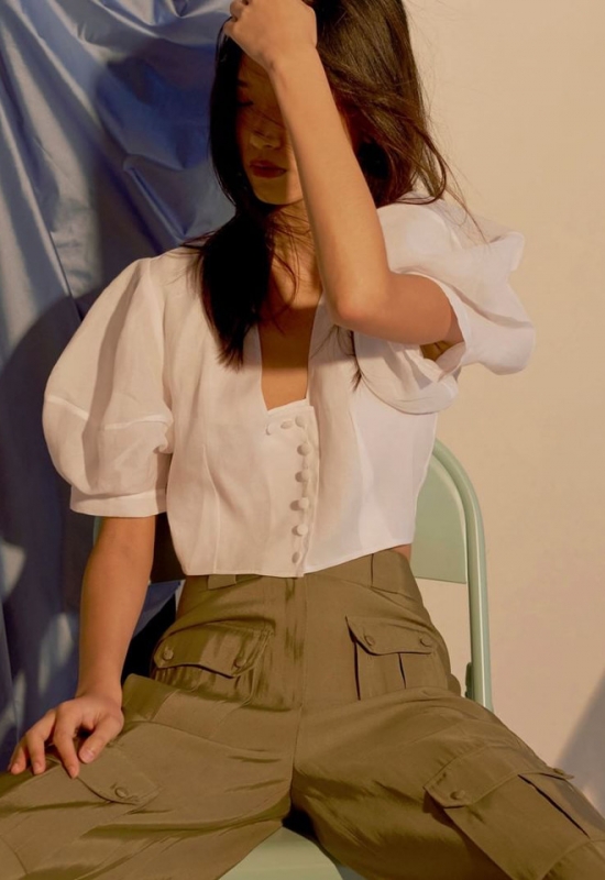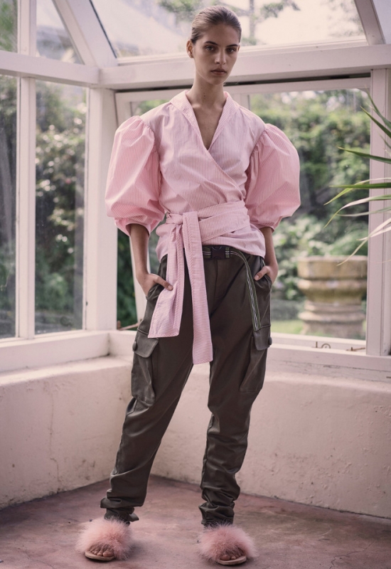 Еще один пример, который доказывает, что баланс — основа не только духовных практик, но и удачных сочетаний. К штанам, которые напоминают о походе, стоит надеть что-то контрастно-девичье: к примеру, розовый топ с рукавами буфф, как у принцессы.