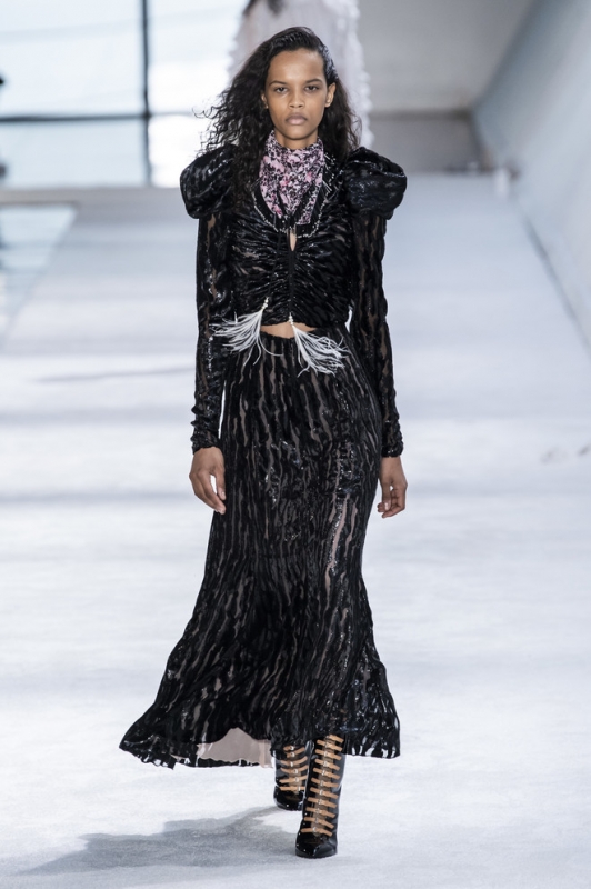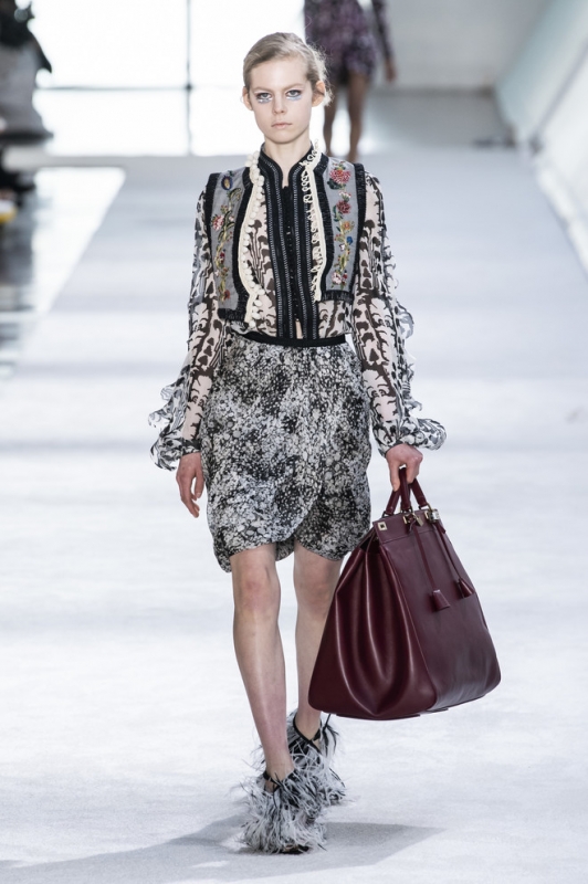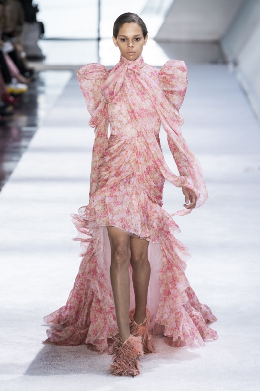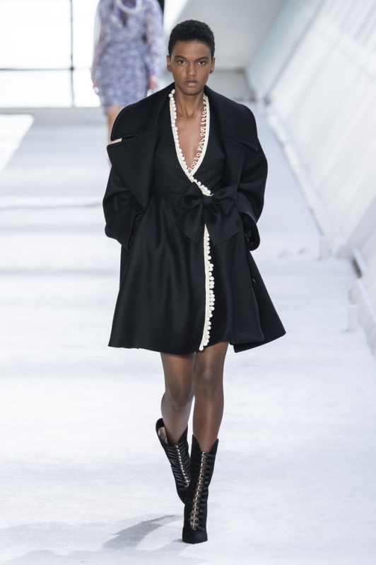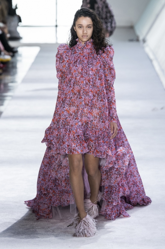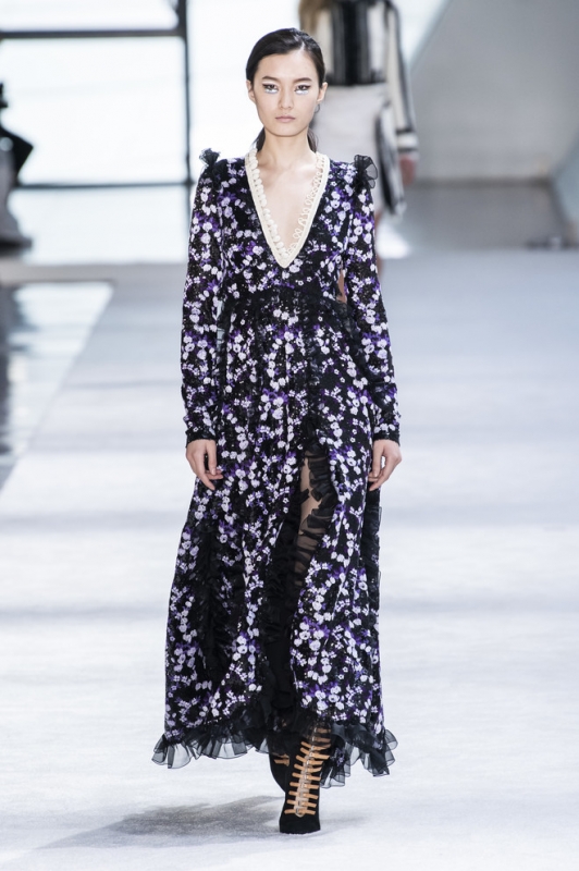 Один из признанных королей голливудских красных дорожек, Джамбаттиста Валли и в этот раз не подвел любительниц эффектных вечерних нарядов: в коллекции есть и летящие юбки, и изящные драпировки, и «королевский» шлейф. Для изящных брючных костюмов и строгих жакетов, впрочем, в коллекции тоже место нашлось. Тема «Нескромное обаяние буржуазии» и пышные цветущие сады Моне в Живерни. Главные источники вдохновения Валли получили отражение в серо-розовой гамме коллекции и флористических принтах. Ключевые тренды Акцент на плечи, объемные рукава, банты и силуэты с завышенной талией. Детали Пушистые босоножки, пышно декорированные перьями. Огромные саквояжи и высокие ботильоны на шнуровке. Отдельного упоминания заслуживает макияж, сделанный для шоу Вэл Гарланд — главной фишкой образов стали «стрелки» из фольги, наклееные на нижние веки.
