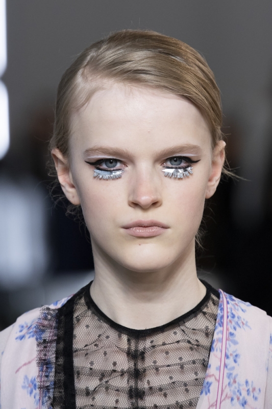 Пушистые босоножки, пышно декорированные перьями. Огромные саквояжи и высокие ботильоны на шнуровке. Отдельного упоминания заслуживает макияж, сделанный для шоу Вэл Гарланд — главной фишкой образов стали «стрелки» из фольги, наклееные на нижние веки.