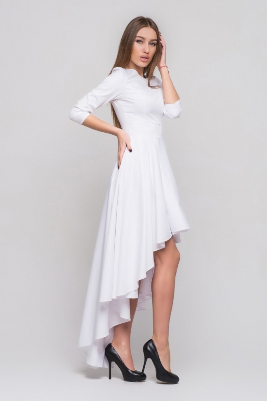 Такое платье можно назвать средним между первым и вторым вариантом. Мини-платье спереди плавно переходит в макси сзади. Этот вариант универсален, подойдет девушкам любого роста. И самое важное в таком фасоне – оно не только очень выигрышно смотрится, но и в нем вы будете чувствовать скованности в движениях танца.