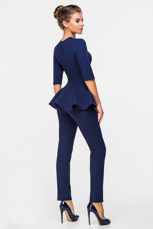Самый стандартный комплект костюма. Фасон здесь может быть абсолютно разный: с зауженными брюками, с укороченными, с широкими; с приталенными пиджаком/жакетом, с прямым, с укороченным, с удлиненным. При выборе подходящего именно Вам фасона нужно учитывать параметры фигуры. Так, например, приталенные жакеты подойдут обладательницам хорошей фигуры и подчеркнут ее еще больше. Прямой жакет подойдет девушкам, у которых плохо выражена талия. Он поможет скрыть этот недостаток и сохранит стильный образ. Либо, если девушка не высокого роста, ей следует выбрать укороченный фасон брюк. Это визуально сделает ее выше.