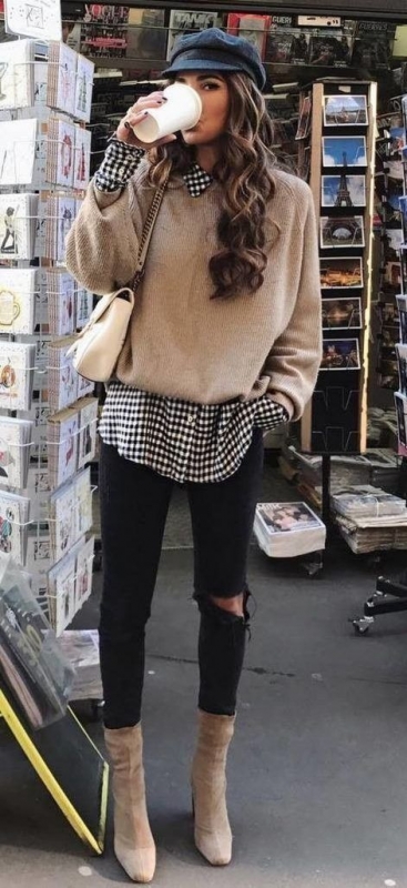 Объемный мягкий свитер из-под которого выглядывают рукава лонгслива. Простая, но эффектная деталь. Тут может быть игра оттенков или, как в варианте на фото, сочетание с принтом.
