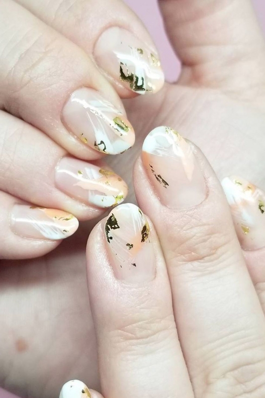 Еще один тренд – мраморный маникюр. Немного хаотичных мазков разными бежевым, пудровым, белым и золотым оттенками – и твой маникюр на высоте!