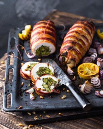 А фудфотограф Елизавета Кириченко предлагает приготовить поркетту (рулет) из диетического мяса - индейки. Известно, что индейка богата белком, а также способствует хорошему сну. То есть если вы таки решили поесть перед сном, выбирайте индейку. Рецепт рулета для этого придется весьма кстати. Ингредиенты:• 1 крупная грудка индейки• 16 ломтиков бекона• 1/2 чиабатты • мелко натертая цедра с 1 лимона• 3 ст. л. песто• оливковое масло• соль и перец по вкусуДля песто• 1 большой пучок свежего зеленого базилика• 2 горсти* рукколы • 1 горсть кедровых орехов• 1 горсть тёртого пармезана• 1 большой зубчик чеснока• свежевыжатый сок 1/2 лимона• 1/2 ч. л. свежемолотой смеси 5 перцев• 1/2 ч. л. морской соли • 100 мл оливкового масла extra virgin (по желанию, можно пропорционально добавить пару ложек ароматного масла: острое с чили, пряное трюфельное, апельсиновое и т. п.)*горсть = полный объём захвата одной рукойПриготовление:1. Кедровый орех поджарить на сухой сковороде с антипригарным покрытием до появления приятного аромата и золотистого цвета. Остудить.2. Соединить все ингредиенты для песто в блендере и взбить до однородности.3. Для начинки чиабатту мелко порвать и смешать с песто и цедрой лимона.4. Грудку индейки надрезать в обе стороны, начиная от центра, таким образом, чтобы ее можно было целиком развернуть одним ровным по толщине куском. Затем разделить на 2 равные части и расположить внешней стороной с пленкой вниз к рабочей поверхности. Аккуратно отбить до 1 см, стараясь не порвать волокно. Посолить и поперчить.5. На каждую часть грудки нанести плотным слоем подготовленную начинку. Слегка утрамбовать, свернуть роллом и расположить швом вниз. Сверху «внахлёст» выложить ломтиками бекона, обернуть индейку и краями бекона запечатать шов ролла. Перевязать роллы бечёвкой, смазать оливковым маслом и запекать 30 мин. в предварительно разогретой до 200°С духовке. 6. Сервировать сразу тёплым, порезав на порции, или подавать в виде холодной мясной закуски. Отлично сочетается с запеченным луком и лимоном.