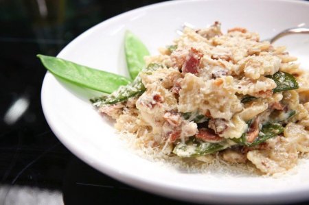 Паста Карбонара от Елены ЯковлевойВам понадобится:Паста бантики – 1 упаковкаБекон сырокопченый – 350грЛук-шалот – 1шт.Зеленый горошек стручки – 200грСливки – 0,5лЯйцо – 1шт.ПармезанМускатный орехСольПерец свежемолотый Приготовление:1. Бантики сварить в подсоленной воде.2. Бекон нарезать небольшими ломтиками и немного обжарить на сухой сковороде, затем добавить мелконарезанный шалот, стручки зеленого горошка и продолжить обжаривание.3. Когда бекон обжарится до золотистой корочки, влить сливки, посолить, поперчить, добавить мускатный орех и потомить на медленном огне. 4. В последнюю очередь добавить яичный желток, натертый пармезан, еще немного потомить и добавить сваренную пасту. Тщательно перемешать.