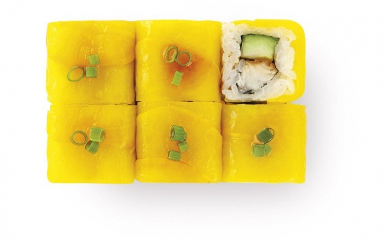 Такуан ролл (360 р.) Копчёный угорь с такуаном, огурцом и соусом «Спайс».