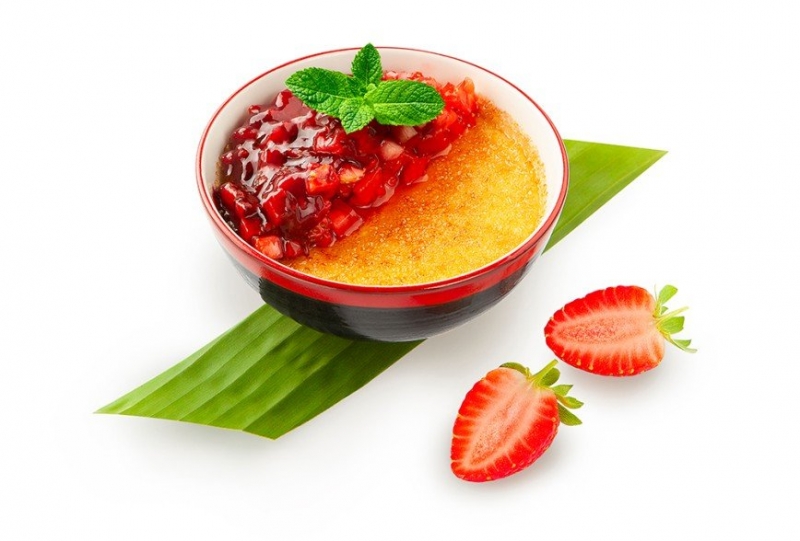 Ичи мусс (320 р.) Крем-брюле из маракуйи со свежей клубникой и малиновым соусом.