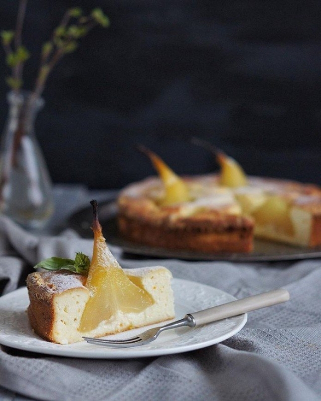 instagram.com/natalioss/ ТВОРОЖНЫЙ ПИРОГ С АПЕЛЬСИНОВЫМИ ГРУШАМИ Ингредиенты:Для груш: Груши 3-5 шт Вода 250 мл Сок 2 апельсинов Полоски цедры 1 апельсина Мед 40 гр Шафран - 1 ч.л. Куркума- 1 щепотка Коробочки кардамона - 4 шт Звездочка аниса по желанию Для теста: Творог (3-4% жирность) - 500 грЯйца - 4 шт Мед - 45 гр Цедра 1 апельсина Кукурузный крахмал - 35 гр Миндальная мука - 45 гр Масло сливочное для смазывания формы instagram.com/natalioss/ Процесс приготовления:1. Сначала приготовить груши. Груши почистить от кожицы. С апельсинов снять цедру. С одного полосками, один потереть на терке. Выдавать и процедить сок. Воду соединить с апельсиновым соком. Добавить мед, специи, довести до кипения. Опустить в подготовленный состав груши и томить на огне 30 минут. Остудить в сиропе. 2. Яйца разделить на белки и желтки. В творог добавить желтки, мед, кукурузный крахмал и все пробить блендером до мягкости. Добавить 40 гр миндальной муки и цедру апельсина. Белки взбить миксером до крепких пик. Аккуратно подмешать белки в творожную массу. 3. Разъемную форму смазать маслом и щедро обсыпать оставшейся миндальной мукой. Выложить творожно-миндальную массу. У трех груш срезать нижнюю часть на 1/3 и порезать ее на кусочки. Груши вдавить в тесто. Уложить между кусочки груши. 4. Выпекать в разогретой до 190 градусов духовке примерно 30-35 мин. Следите за готовностью. Готовый кекс остудить, освободить от формы. Посыпать сахарной пудрой. instagram.com/natalioss/ КЕКС С ГРУШАМИ Ингредиенты (на форму 20-23 см):Яйца - 3 шт (крупных)Сахар -150 гр (можно меньше)Мука - 150 гр (просеять )Крахмал кукурузный - 30 грСоль - щепотка Разрыхлитель - 1 ч. л. Ванильный экстракт - 1/2 ч. л.Сливочное масло - 90 грГруши сладкие - 4/5 шт Для крема: Яйцо - 1 штСахар - 80 грКрахмал - 1 ст. л.Мука - 1 ст. л.Молоко - 150 грСгущенное молоко - 1 ст. л.Масло сливочное - 80 гр Процесс приготовления:1. Духовку разогреть до 180 гр. Груши почистить и порезать мелкими кусочками.2. В большой миске взбить яйца с сахаром в пышную массу, сухие ингредиенты все объединить, смешать и добавить аккуратно в яичную смесь. Затем добавить растопленное сливочное масло и ваниль, все перемешать. Затем добавить груши и также перемешать.3. В форму, смазанную сливочным маслом, вылить тесто и выпекать около 40- 45 минут до готовности. Остудить на решетке. Присыпать по желанию сахарной пудрой либо полить сверху заварным кремом. Подавать теплым. Как приготовить крем: 1. Яйцо растереть с сахаром, добавить муку и крахмал, все перемешать. Добавить горячее молоко, все перемешать и поставить массу в ковшике на медленный огонь. Постоянно помешивая, довести массу до загустения и пузырьков. Не варить. Следить, чтобы не пригорело. 2. Добавить сгущенное молоко, пробить блендером и остудить. 3. Масло взбить и добавлять по ложке остывшую заварную массу.4. Полить кремом пирог. Украсить грушами из рецепта выше. instagram.com/natalioss/ ГАЛЕТА С ГРУШАМИ И СЫРОМ РОКФОР Ингредиенты:Тесто: Масло сливочное - 130 грЯйцо - 1 штСоль - 1/3 ч. л.Сахар - 1 ст. л.Разрыхлитель - 1 ч. л.Холодная вода - 1 ст. л. Цельнозерновая мука - 100 грПшеничная мука (в/с) - 140 гр Начинка: Груши (лучше сладкие) - 4 штСыр Рокфор - 75 грОрехи грецкие - 30 грМед - 1 ст. л.Сахар - 1 ч. л. instagram.com/natalioss/ Процесс приготовления:1. Холодное сливочное масло порезать кусочками, быстро взбить с яйцом, добавить соль, сахар, разрыхлитель, муку и замесить тесто. При необходимости добавить 1 ст. л. воды. Тесто скатать в шар, за