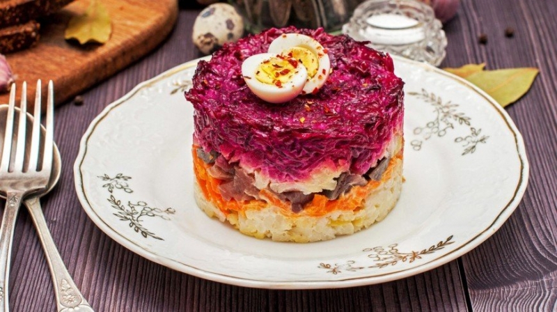 Селедка под шубойНаверное, второй по популярности салат после Оливье. Со временем вариантов этого блюда появилось великое множество, мы предлагаем один из вариантов.1. Мелко порезанная очищенная селедка2. Тертая вареная картошка3. Тертая вареная морковь4. Тертая вареная свекла5. Майонез6. 2 вареных яйца, мелко покрошенные7. Повторить слои 1-5