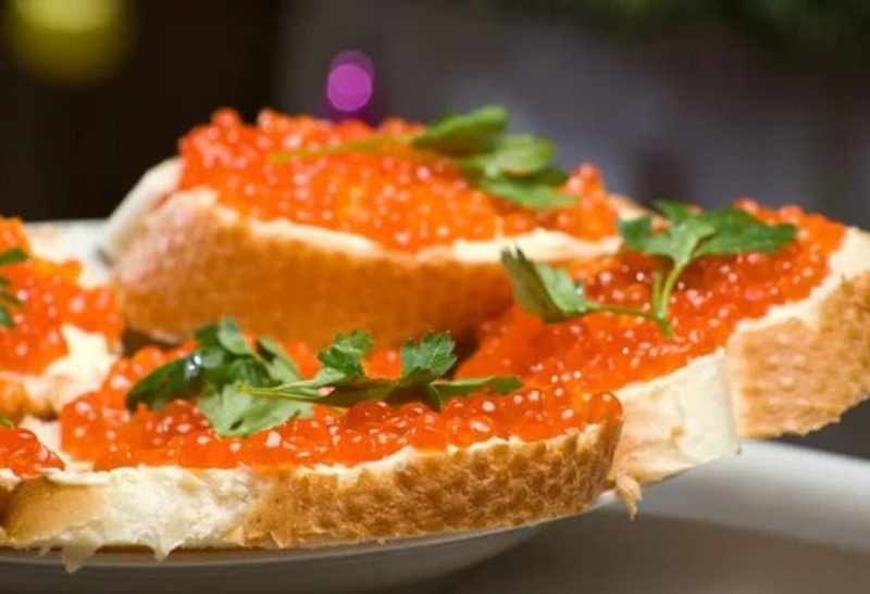 Бутерброды с икройБутерброды с икрой и красной рыбой - еще один непременный атрибут советского стола. И ведь были времена, когда на столах присутствовала не только красная, но и черная икра, соленая горбуша и палтус, осетрина горячего и холодного копчения. Кстати, многие предпочитали вместо бутербродов с икрой подать на стол вареные яйца, разрезанные на половинки, сверху на которых лежала икра горкой.