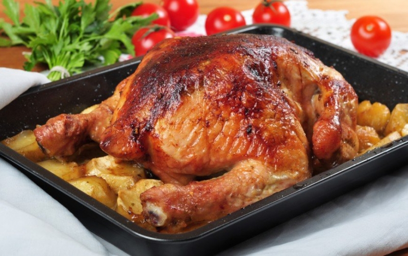 Запеченная курица с картошкойОдним из самых популярных горячих блюд на новогоднем столе была запеченная в духовке курица с картошкой. Ароматная птица с румяной корочкой и сейчас остается весьма частым гостем на столе: готовится быстро, усилий не требует, а результат почти всегда отменный.Ингредиенты:1 крупная курица 2,5 кг1 кг картофеляСоль, перец, чеснокСметанаРастительное маслоПриготовление:Тушку курицы моем под холодной проточной водой. Даем стечь воде. Снаружи и внутри натираем курицу солью, перцем и чесноком. После этого курицу обмазываем снаружи растительным маслом или сметаной.Картошку чистим, обмываем, а затем режем дольками или кружочками, кому как больше нравится. На смазанный жиром противень сперва выкладываем курицу, а вокруг нее располагаем картошку. Противень с курицей и картошкой ставим в горячую духовку, разогретую до 220°С, запекаем полтора часа. Время от времени картошку мешаем, а курицу поливаем выпущенным жиром. Запеченную в духовке курицу вместе с картошкой выкладываем на большое блюдо, украшаем зеленью и подаем к столу.