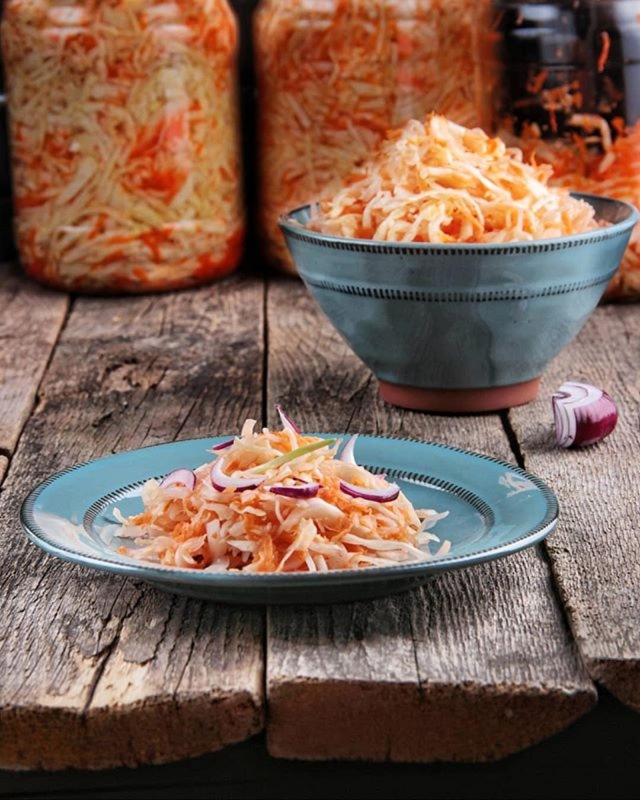 Ингредиенты (на 3-литровую банку): ?Капуста 3,2 кг?Морковь 3 шт среднего размера?Соль 2 ст.л. с горкой Процесс приготовления: 1. Капусту нашинковать, морковь натереть на крупной терке. Перемешать овощи с солью (не мять и не перетирать). 2. Сложить в 3-литровую банку, сильно утрамбовывая с помощью толкушки. Банку поставить в миску. Выделившийся в процессе утрамбовывания сок из миски не сливать, он может пригодиться.3. Банку в миске оставить при комнатной температуре на 2-3 дня. На второй день капуста начнет пузыриться, несколько раз проткнуть ее деревянной шпажкой, чтобы вышли газы.4. Когда пузырение закончится (через 3-4 дня), можно убирать в прохладное место, долив по необходимости сок и их миски. Капуста готова к употреблению. Перед подачей добавить лук и полить ароматным маслом.