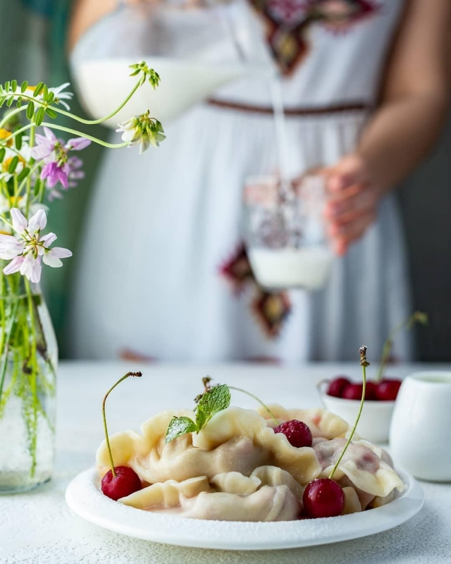 Автор фото и рецепта Елена Соловьева: instagram.com/loka.lunch/ Ингредиенты (на 8-10 вареников):Начинка: 150 г вишни без косточек (с косточками 180 г)2-4 ст.л. сахара Тесто: 1 стакан мукищепотка соли 75 мл воды Соус: сметанамяталимонный сок или цедра лимона вишневый сок с сахаром из начинки Процесс приготовления:1. Вишню засыпать сахаром. Количество сахара напрямую зависит от естественной сладости вишни. Отставить в сторону.2. Насыпать в миску муку, соль, влить воду. Замесить крутое тесто. Вымешивать от 5 минут, оно должно стать однородным, но остаться достаточно твердым. Положить тесто в миску, накрыть, дать отдохнуть 20 минут. Это обязательный этап! С недостаточно полежавшим тестом работать очень сложно. А после отлежки оно мягкое, эластичное, крайне приятное в работе.3. Вишня за это время пустит сок, его нужно слить (не выбрасывайте, пригодится!). Если вишня очень влажная, можно добавить пару чайных ложек муки или крахмала.4. Тесто раскатать, вырезать кружки, формой нужного вам размера. Уложить в центр начинку, закрепить шов. Вареники можно замораживать, можно варить сразу. Готовятся они 2-5 минут после всплытия, зависит от того, насколько тонко вы раскатали тесто.5. К вареникам можно сделать соус: сметану, мяту, лимонный сок или цедру с соком (с соком осторожно, чтобы соус не вышел кислым), вишневый сок с сахаром, который был слит из миски с вишневой начинкой пробить блендером и подавать к вареникам.