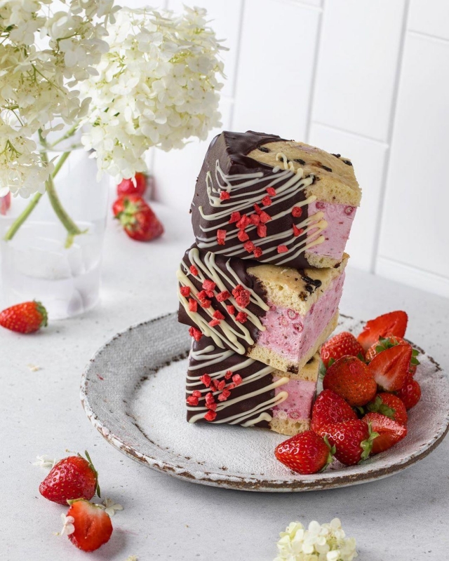 Автор фото и рецепта Дарья Близнюк: instagram.com/zhabcka/ Ингредиенты:Тесто: Яица 180 гСахар 60 гВанильныи сахар 10 гМука пшеничная 140 гМука миндальная 20 гРазрыхлитель 6 гШоколадные капли 20 гСоль 2 г Мороженое: Клубника 250 гСгущеное молоко 150 гВаниль в любом видеСливки 33-35% 250 гЯгодные крипсы 150 г Глазурь: Шоколад 150 гМасло растительное 30 г(Можно добавить дробленыи орех) Процесс приготовления: Для коржа: Соединить оба вида муки, соль, разрыхлитель венчиком. Взбить яица с двумя видами сахара в пышную массу. Соединить обе массы аккуратно, выложить прямоугольник размером 30х40 на противень, застеленныи пергаментом, посыпать шоколадные капли. Выпекать 10-12 минут в разогретои до 200С духовке. Снять с пергамента, остудить и разрезать на два равных прямоугольника, края обрезать, если они получились неровными. Для мороженого: 1. Клубнику превратить в пюре блендером, добавить сгущенку и ваниль. Взбить сливки в пышную массу, но не переусердствуйте! Аккуратно объединить обе массы.2. Прямоугольную форму застелить пленкои. Если используете силиконовую, то не надо. Выложить корж каплями шоколада вниз, слои клубничныи, посыпать крипсами или можно добавить ягодки малины, разровнять, сверху корж каплями шоколада вверх, прижать немного, закрыть пленкои и оставить на ночь в морозилке. 3.Достать заготовку и нарезать прямоугольниками. Можно оставить так или обмакнуть каждыи прямоугольник в глазурь. Для глазури надо растопить на водянои бане или импульсно в микроволновке шоколад, остудить до 35-37С и обмакнуть половинки сэндвича в этои массе, положить на доску, на пергамент и нанести декор белого шоколада, любые посыпки/ореховую или сублимированную крошку.