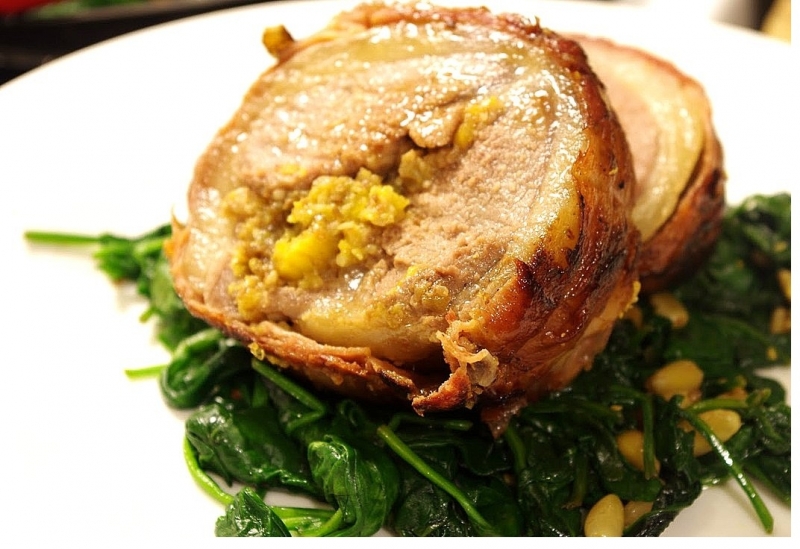 Смешиваем чуть поджаренный тмин, соль и перец. Все измельчаем в ступке. Полученной массой из специй полностью обмазываем мясо. Далее делаем начинку. В блендере измельчаем несколько кусочков белого хлеба и абрикосы. В полученную хлебо-абрикосовую массу добавляем поджаренные кедровые орешки, соль и перец по вкусу. Затем вливаем чуть оливкового масла и хорошо перемешиваем. Начинку выкладываем в центр куска мяса, а по бокам кладем 2 кусочка филе. Затем все туго заворачиваем в рулет. На пищевую пленку выкладываем тонкий слой пармской ветчины и заворачиваем в нее наш рулет. Потом помещаем его в холодильник на 1 час. Далее снимаем пищевую пленку, обматываем рулет пищевой нитью, чтобы он сохранил свою форму. Разогреваем сковороду, наливаем туда оливкового масла и обжариваем мясо со всех сторон. Солим, перчим по вкусу и помещаем в, заранее разогретую, духовку на 40 минут. Даем готовому мясу немного отдохнуть, тогда оно будет более нежным.