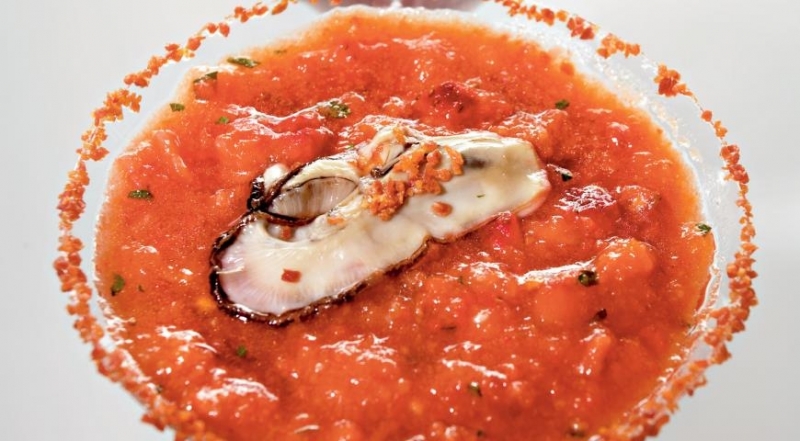 Клубничный гаспачо с устрицей и пылью из хамона - «Первое блюдо»