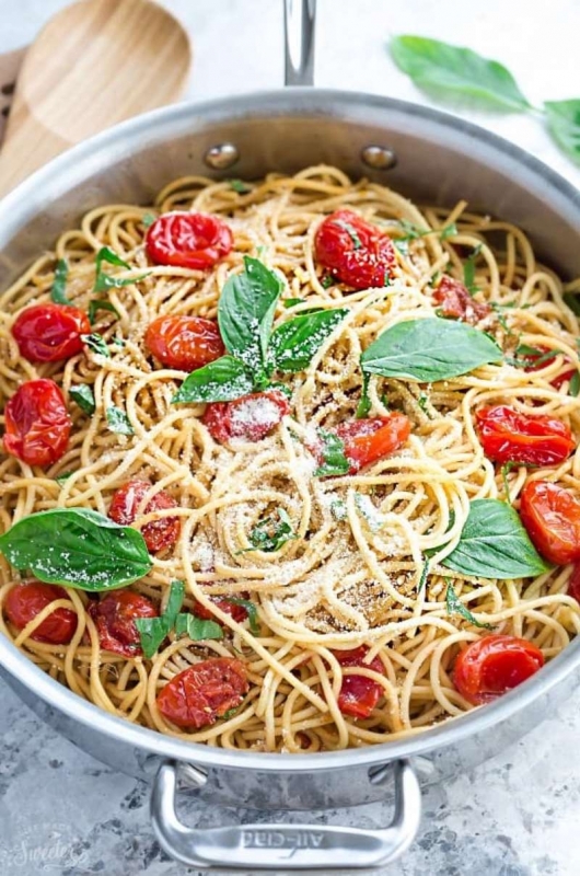 Это не жирное и не тяжелое блюдо. В рецепте использованы свежие здоровые ингредиенты, а сочетание базилика и чеснока опьяняет и вызывает дичайший аппетит! Ингредиенты: 15–20 помидоров черри ----------------------------- 1 перец чили ----------------------------- 300 г спагетти ----------------------------- 4 ст. л. оливкового масла ----------------------------- 30 г твердого сыра ----------------------------- 3 зубчик чеснока ----------------------------- 1 луковица ----------------------------- 1 пучок базилика ----------------------------- 400 мл воды ----------------------------- соль по вкусу ----------------------------- Приготовление: Вымой помидоры черри и разрежь каждый пополам. Очищенный чеснок нашинкуй тонкими пластинами. Стручок перца чили нарежь кружочками. Разрежь луковицу пополам и нашинкуй полукольцами. Возьми широкую кастрюлю, такую, чтобы макароны свободно помещались на дно. Выложи в нее сухие спагетти. Добавь лук, чеснок, острый перец и черри. Но не высыпай непосредственно на спагетти, а разложи по обе стороны. Помой базилик и порви его руками, большую часть положи в кастрюлю. Отложи немного листьев, они еще понадобятся. Добавь оливковое масло, посоли и поперчи по вкусу. Влей в кастрюлю холодную воду. Включи огонь и доведи до кипения. Подожди 10 минут, пока все ингредиенты не перемешаются. Натри сыр на терке прямо в кастрюлю. Добавь оставшиеся листья базилика и еще пару щепоток соли и перца. Через несколько минут паста с помидорами будет готова к подаче на стол. СОВЕТ Тебя удивило, что в рецепте спагетти заливаются холодной водой? Всё правильно. Дело в том, что макароны, приготовленные в малом количестве воды, имеют значительное преимущества: в небольшом объеме воды спагетти быстрее варятся и остаются аль денте. Кроме того, макароны выделяют в воду крахмал, поэтому твоя паста будет буквально плавать в нежном соусе. Благодаря этому способу макароны можно сварить буквально за 4 минуты. Такой рецепт гарантирует, что паста не будет липкой или сырой. Через минут 15 у тебя будет готовая паста с отличным соусом в одной кастрюле. Настоящий итальянский ужин менее чем за полчаса! Если ты владеешь секретами, как приготовить пасту в домашних условиях, поделись в комментариях и расскажи друзьям. Приятного Вам аппетита!