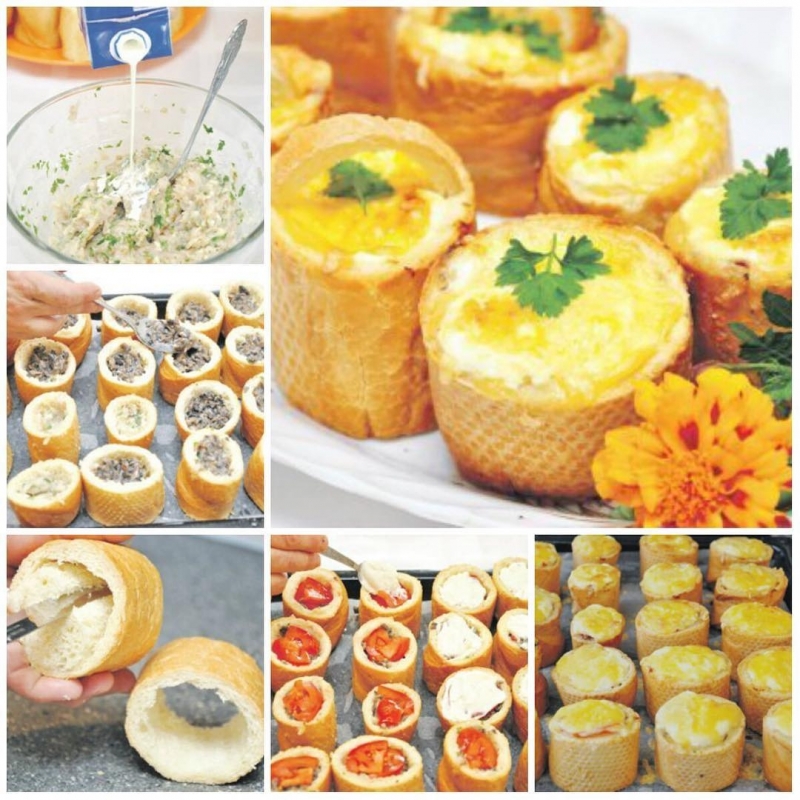 Багет разрезать поперек на несколько частей, чтобы получились цилиндры или «бочонки», и аккуратно удалить мякиш.