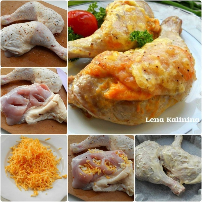 Ингредиенты: окорочка куриные - 2 шт.; ---------------------- сыр твердый - 70-80 г; ---------------------- чеснок - 2 зубчика; ---------------------- сметана или майонез домашний - 2 ч. л.; ---------------------- смесь перцев, приправа для курицы - по вкусу; ---------------------- соль - по вкусу; ---------------------- масло растительное - 1 ч. л. (для смазывания). Приготовление: Окорочка хорошо вымыть, обсушить, посыпать солью, смесью перцев и приправой. Аккуратно оттянуть кожу и острым ножом сделать прорезы в мясе, где получится, вокруг кости. Прорезы стараться делать не сквозные. Сыр натереть на мелкой терке. Разрезы в окорочках нафаршировать тертым сыром, хорошо вдавливая его внутрь вместе с порезанным чесноком. Немного мясо еще посолить и оставшимся сыром посыпать сверху. Шкуру аккуратно натянуть. Смазать окорочка сметаной или майонезом. Поместить в форму для запекания, застеленную пергаментом и чуть смазанную растительным маслом. Запекать вкуснейшие и аппетитнейшие окорочка, фаршированные сыром, в предварительно разогретой до 180 градусов духовке 35-45 минут до красивой румяной корочки. Подавать в теплом виде с овощами и зеленью. Советую! Приятного Вам аппетита!