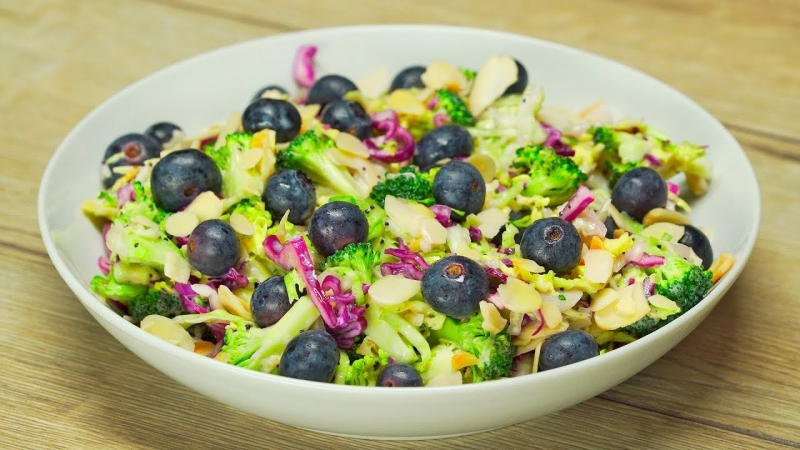 Этот совсем несложный в приготовлении салат включает в себя сразу четыре вида капусты. Четыре оригинальных вкуса в сочетании с насыщенным соусом, голубикой и миндалем, делают салат из капусты изысканным, необычным и при этом полезным. Уверены, такой капустный салат полюбят ваши близкие.