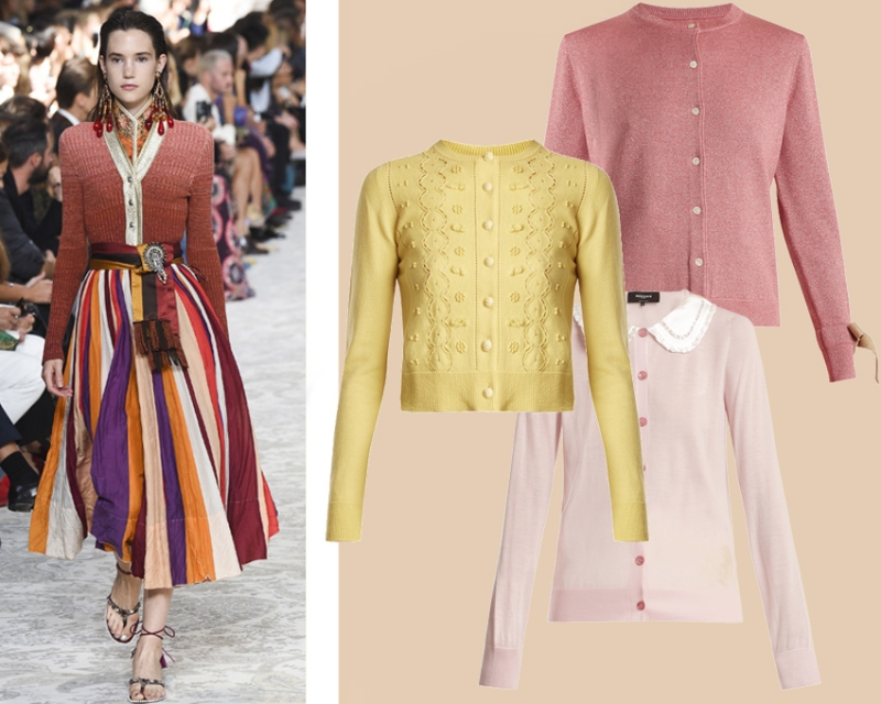 Кардиганы, напоминающие о модных трендах 1940-х, снова в строю. В этом году держимся как можно дальше от темных цветов и выбираем жизнерадостные оттенки. На показе Etro тонкие кардиганы стилизовали с пышными юбками и крупными серьгами в этническом стиле.
