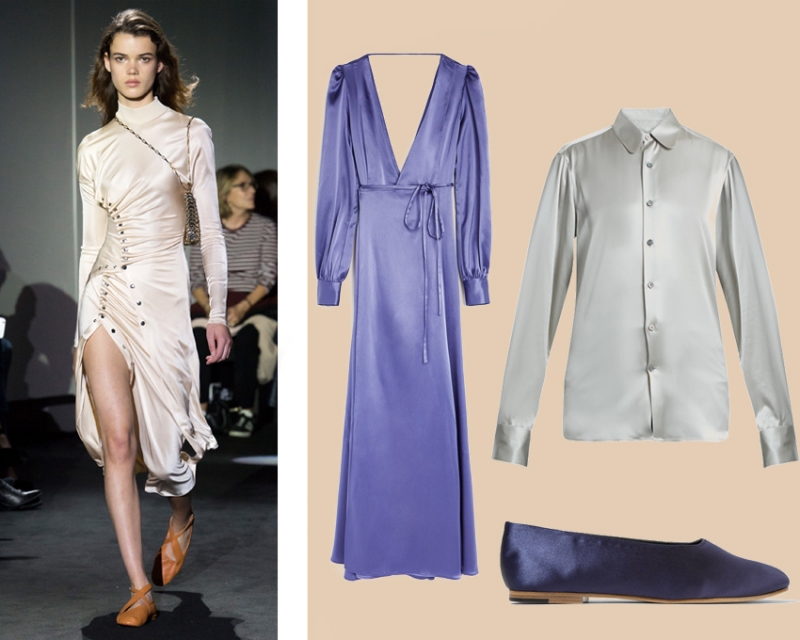 Весной на смену яркому экомеху, вельвету и бархату придет нежный сатин. Советуем отдавать предпочтение платьям длины миди и макси, а еще не списывать со счетов аксессуары и обувь, напоминающую балетные пуанты. Особенно круто сатин выглядит в пастельном исполнении, а также в фиолетовом, который институт Pantone назвал ключевым цветом 2018 года.