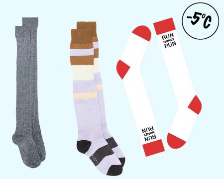 Высокие теплые гольфы из плотного хлопка или шерсти — великая замена и носкам, и колготкам, если речь идет о джинсах. Очевидный прием, которым почему-то мало кто пользуется. Не сработает с узкими джинсами: удовольствие натягивать штаны поверх плотных гольфов — мягко говоря сомнительное, а вот с классическими прямыми джинсами или брюками лучше ничего не придумать. При температуре –10 °С, –15 °С ты точно не замерзнешь и будешь чувствовать себя очень комфортно. Во время более серьезных морозов советуем переходить на легинсы с флисом.