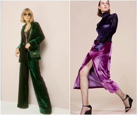 Представляя бархат или вельвет, мы часто держим в голове темные цвета и мрачные оттенки, хотя эти материалы смотрятся очень классно и необычно в ярком исполнении. Зеленый, лиловый, оранжевый, фиолетовый бархат и вельвет присутствовали во многих зимних коллекциях, сохранили свои позиции в весеннем сезоне и уже «засветились» в коллекциях pre-fall. Особенно выигрышно смотрятся два предмета из бархата, схожих по оттенку.