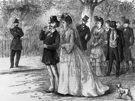 «Свадьба в Булонском лесу», ноябрь 1874 года.Мари Ворт, урожденная Мари Августин Верне, работала «девушкой в магазине» «Maison Gagelin». В ее обязанности входила примерка одежды, чтобы клиенты могли как следует рассмотреть вещи и аксессуары «в действии». В этом магазине будущий император моды Чарльз Фредерик Ворт и познакомился с Мари. Ворт также работал в «Maison Gagelin» и со временем начал придумывать наряды специально для своей возлюбленной.
