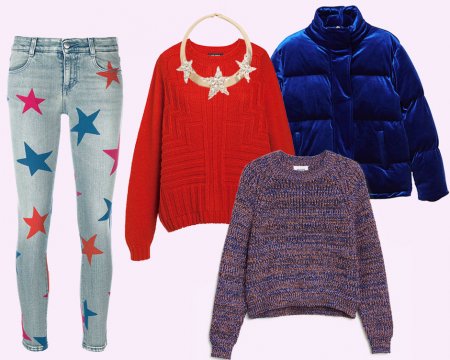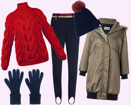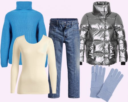 К цветным джинсам и свитеру добавь яркий легкий пуховик с однотонным комплектом из шапки, шарфа и перчаток. Не ограничивай себя в выборе: насыщенный красный, глубокий синий, броская фуксия.