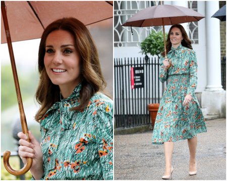 Герцогиня Кембриджская подает хороший пример всем обладательницам рабочего дресс-кода. Урок номер один: иногда можно закрывать глаза на правила. Обычно мы привыкли видеть Миддлтон в строгих костюмах и вещах сдержанных оттенков, но тут она выбрала яркое зелено-оранжевое цветочное платье Prada, и стоит признать, наряд очень идет герцогине.
