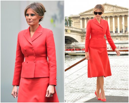 Для официального визита в Париж супруга американского президента выбрала один из своих любимых цветов — насыщенный красный. В таком же она отмечала Рождество в Белом доме. Этот оттенок и правда очень подходит для всех торжественных мероприятий. Один из модных уроков первых леди — однотонные костюмы всегда выглядят дорого и стильно.