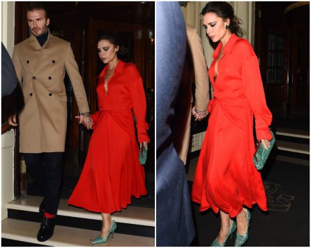 Выпустив идеальные туфли для вечеринки — из зеленого и розового глиттера, — Виктория Бекхэм теперь не упускает ни единой возможности самой покрасоваться в них. Мы влюбились в сияющие лодочки раз и навсегда. Даже с красным платьем в ретростиле они смотрятся очень красиво.