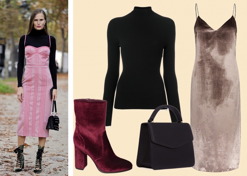 Самый простой способ носить платье в бельевом стиле зимой — в компании водолазки или джемпера. Если хочешь чего-нибудь эдакого, попробуй совместить одинаковые интересные фактуры: например, бархатные ботильоны и платье.