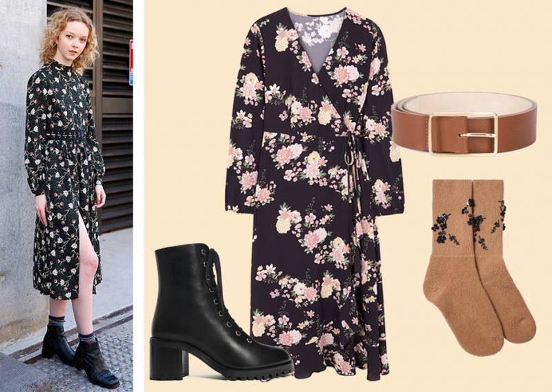 Платье в цветочек чуть ниже колена — один из самых многофункциональных предметов гардероба как летом, так и в холода. Главный трюк в этой истории — бери платье в темных оттенках: такое проще всего носить с плотными черными колготками и ботильонами. Еще один милый образ — ботильоны на шнуровке и широком устойчивом каблуке и проглядывающие нарядные гольфы или пестрые носки.