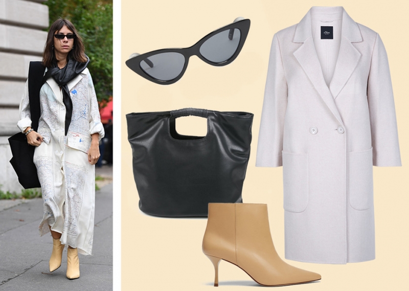 Пастельная гамма обещает стать мощным трендом в весенне-летнем сезоне. Не видим смысла дожидаться весны (к тому же раньше мая она вряд ли наступит) и советуем примерять молочные, фисташковые и лимонные оттенки прямо сейчас. Для создания образа девушки-меренги нам потребуется: светлое пальто, ботильоны кремового оттенка, футуристические очки и объемная черная сумка.