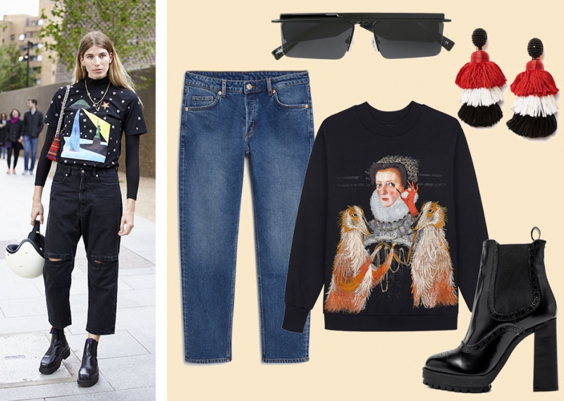 Самый очевидный ответ на вопрос, с чем носить ботильоны, — джинсы. Чтобы образ выглядел нескучно, попробуй скомбинировать яркий свитшот, ботинки на каблуке и крупные серьги друг с другом.